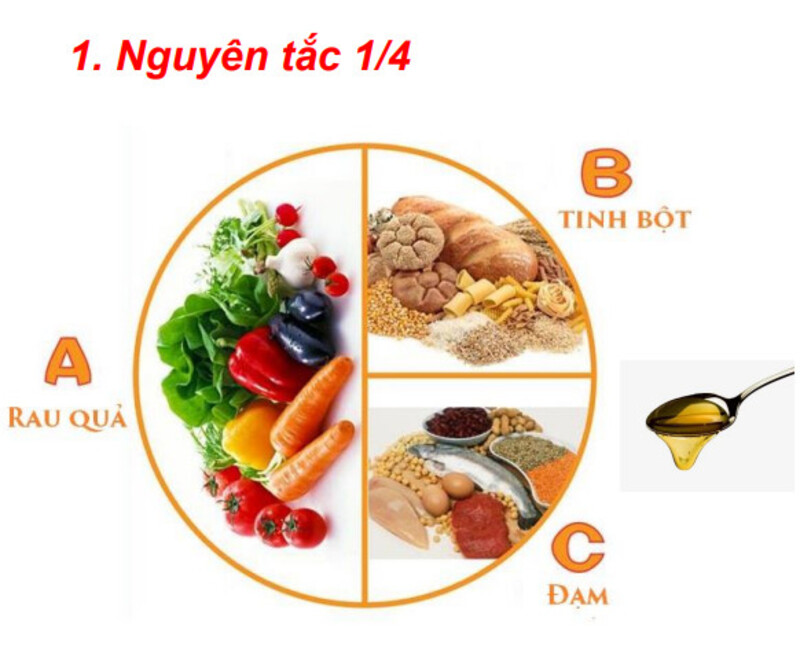 - Mô hình đĩa ăn nên gồm: 1/2 rau không tinh bột, 1/4 protein nạc, 1/4 carbohydrate chất lượng